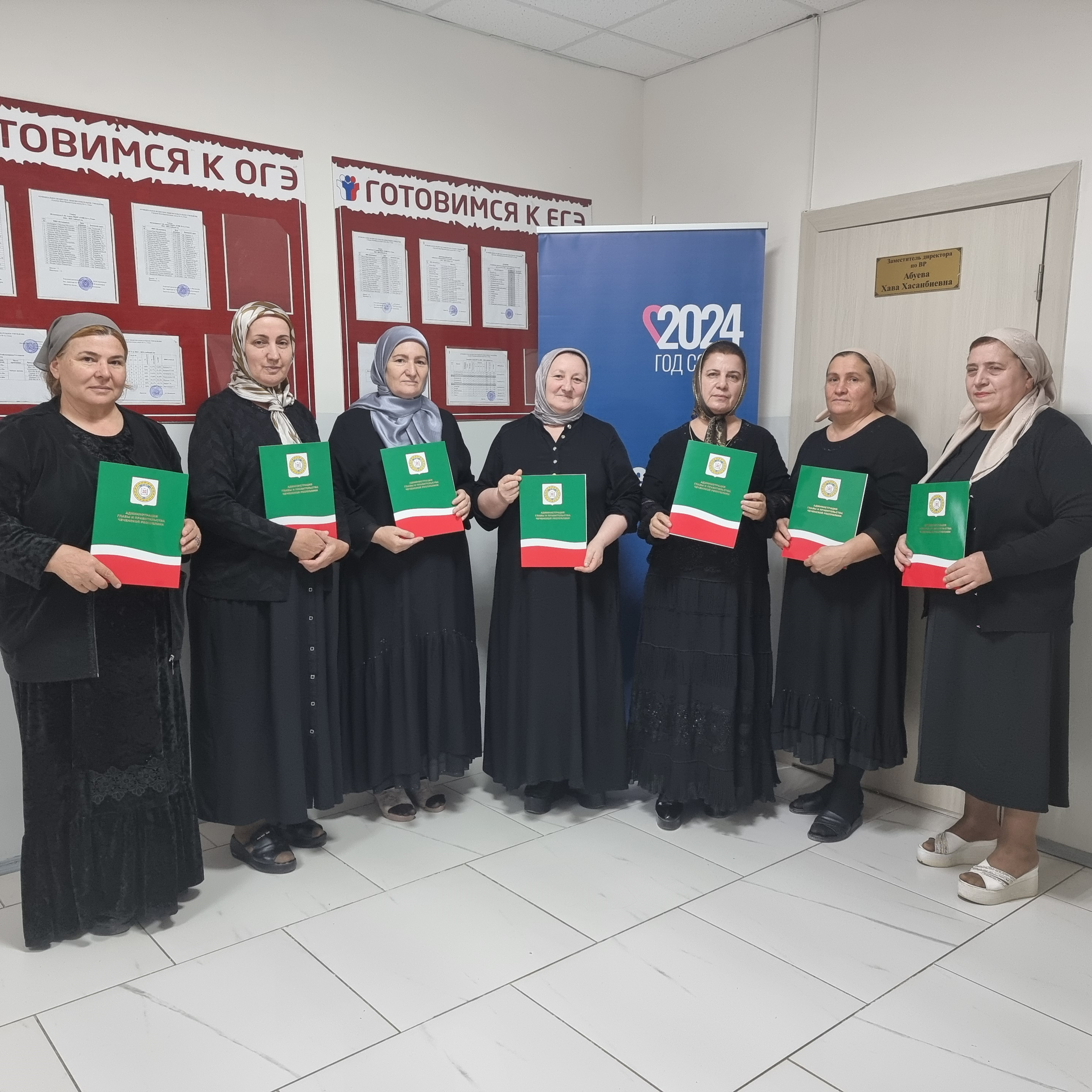Исмаилова Р.С. - директор; Абуева Х.Х. - зам.дир. по ВР, Тутаева Л.Ш. - зам.по ИКТ, Астамирова Ф.А.- зам. по МР, преподаватель химии - Магомедова Р.А., преподаватель технологии - Абуева П.Х., преподаватель русского языка - Магомадова Т.Б., преподаватель физики - Бакаев С.В., преподаватель чеченского языка - Амерханова Б.Ш.