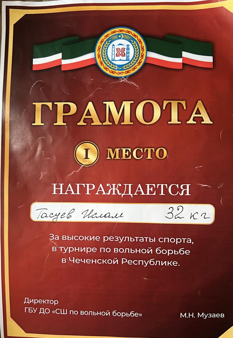 1 место в турнире по вольной борьбе занял наш ученик 6 А класса Тасуев Ислам. Награжден грамотой за высокие результаты спорта, в турнире по вольной борьбе в Чеченской Республике. Дала т1аьхье беркате йойла!