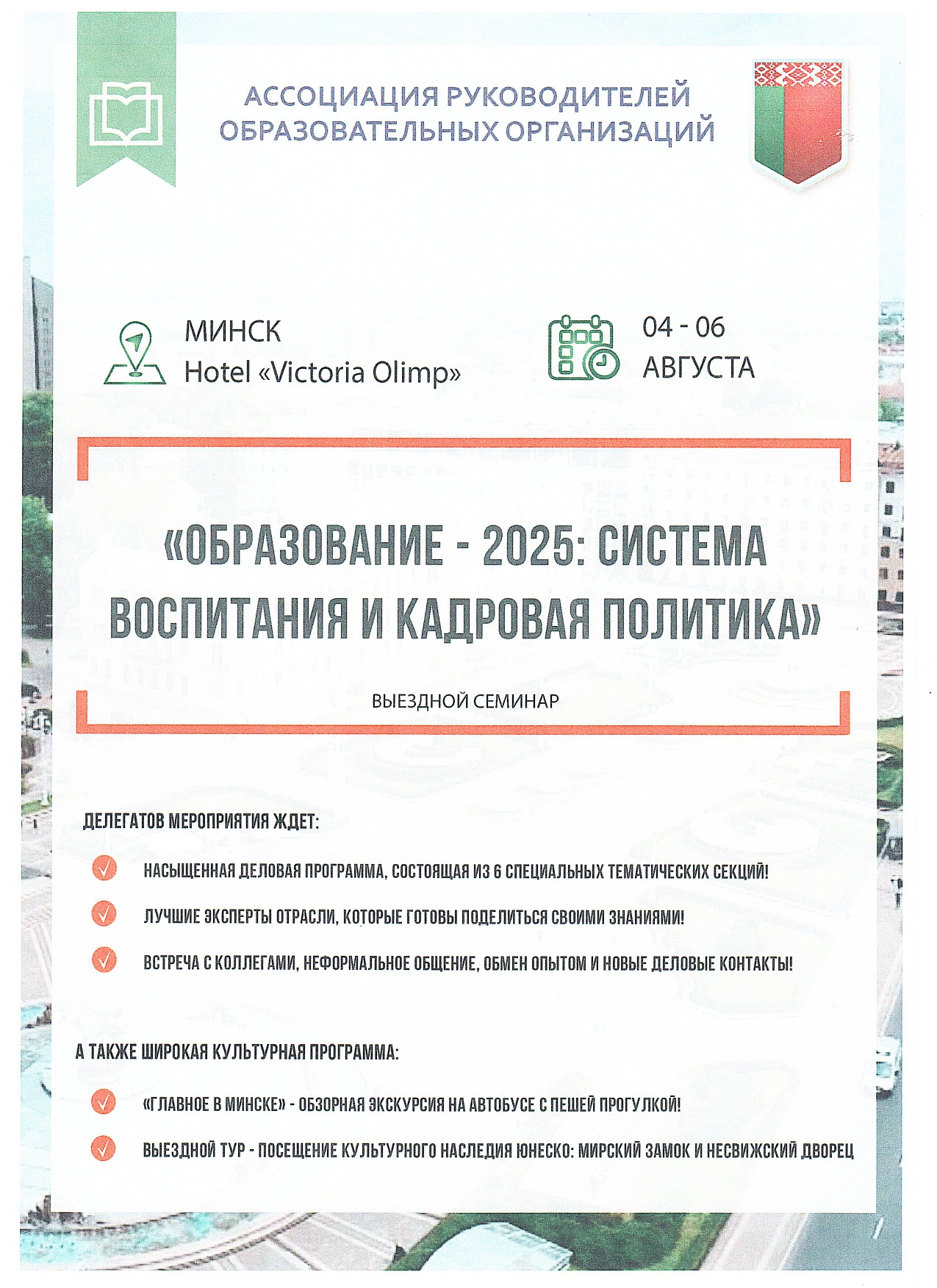 В период с 04 по 06 августа 2025 года в Республике Беларусь в городе Минске состоится Выездной семинар руководителей образовательных организаций «Образование - 2025: система воспитания и кадровая политика». Кроме насыщенной образовательной программы, участникам будет предложена увлекательная экскурсионная программа по столице Республики Беларусь.